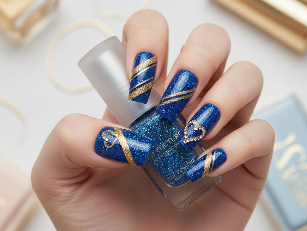 Corazones sutiles, líneas onduladas o detalles minimalistas en tonos rosa sobre uñas azules ofrecen un equilibrio entre dulzura y fuerza. Muy popular en primavera y verano.