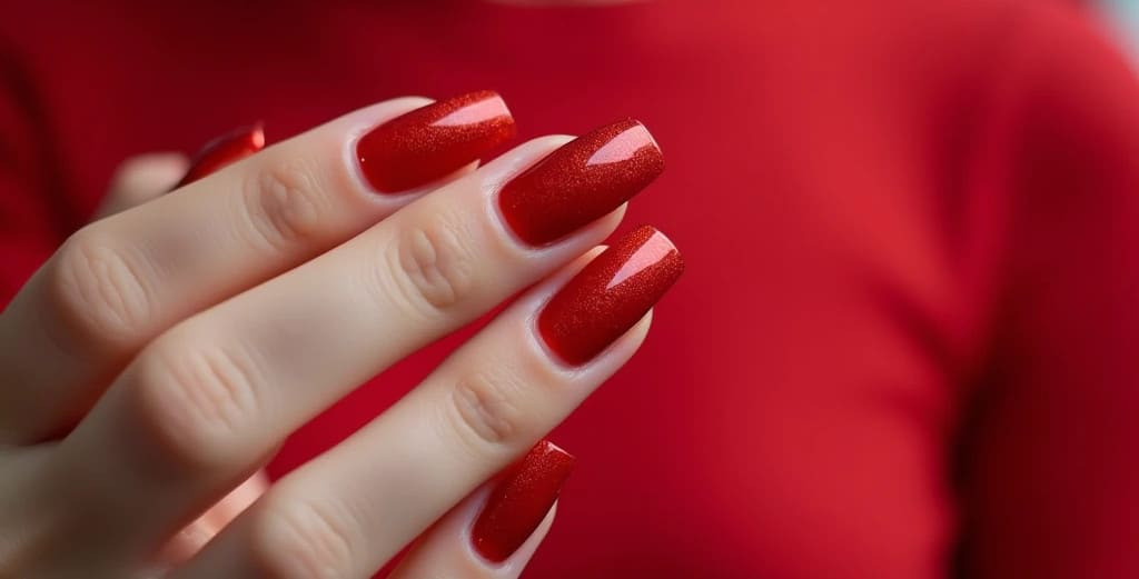 Para aquellas que quieren un toque de glamour adicional, las elegantes uñas acrílicas rojas con un brillo sutil son perfectas. Agrega una capa de brillo sobre el color rojo para un efecto sofisticado que captura la luz y da un aire lujoso a tus manos. Es ideal si buscas algo simple pero con un toque especial.